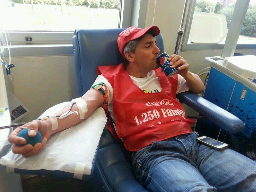 Trabajador de Coca Cola bebe Pepsi Cola, mientras dona sangre al Centro de Transfusión. Hace boicot a Coca.Cola porque esta empresa quiere despedir a 1200 trabajadores, y se niega a donar a Cruz Roja trás enterarse que, esta a pesar de usar los atuobuses, las bolsas y demas instrumental son de la sanidad pública, cobra 67€ por bolsa de sangre donada por la ciudadanía.